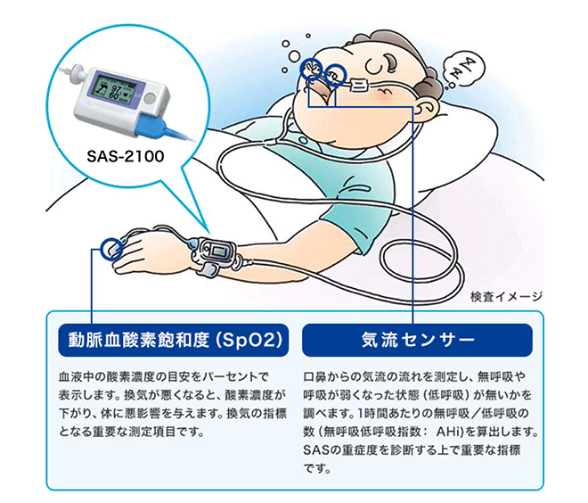 SASとは、10秒以上続く無呼吸が一晩(7時間以上の睡眠中)に30回以上、もしくは睡眠1時間に平均5回以上起こるものです。