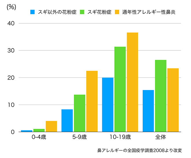 10 – 19歳での花粉症は大人と同程度