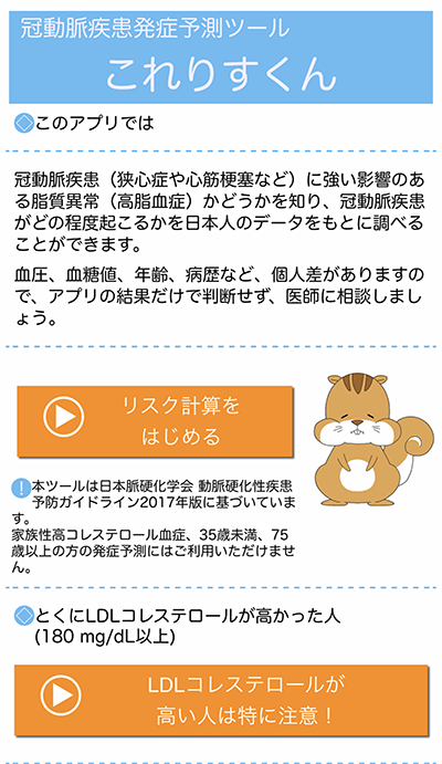 今回は日本動脈硬化学会が一般の方向けに公開している冠動脈疾患(心筋梗塞や狭心症のことです)発症予測ツール「これりすくん」についてご紹介したいと思います。