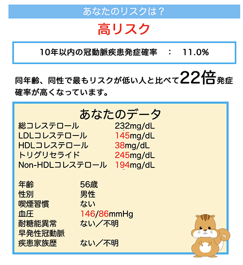 空欄に合わせて必要事項の入力を終えると、10年以内に狭心症や心筋梗塞などを起こす確率がどの程度あるか、同年代と比較してどの程度か、が出てきます。