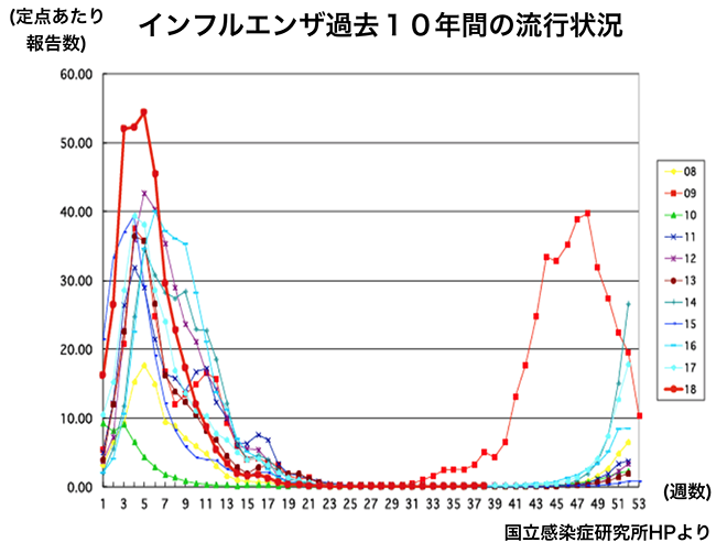 インフルエンザの流行は多少の地域差はあるものの例年11月から12月頃に始まり(44週が11月の始まり)、12月下旬から3月上旬にピークをむかえます(下図)。インフルエンザが大流行した2009年は8月上旬とかなり早期から流行がみられていますが今年は現時点(38週:9月23日までの報告)で流行はみられていません。