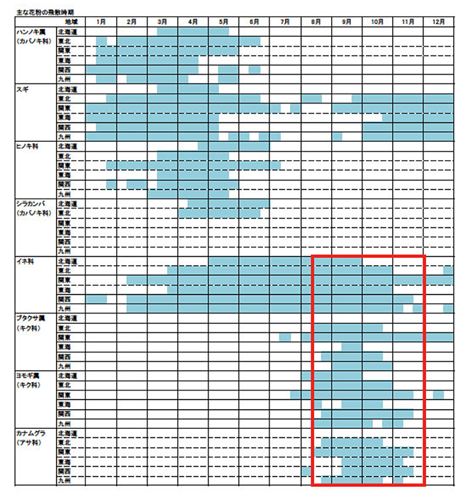 下の表は主な花粉の飛散時期をまとめたものですが、秋に多く花粉が飛散する植物をみてみますと、イネ科:カモガヤなど、ブタクサ属(キク科)、ヨモギ属(キク科)、カナムグラ(アサ科)となっていることがわかります。
