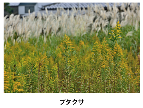 ブタクサ、ヨモギは全国的に分布しているキク科の植物で、特にブタクサはスギ、ヒノキに次ぐ発症者をもつ花粉症の原因植物です。開花時期は8月~10月頃、ブタクサは黄色、ヨモギは紫褐色の花を咲かせます。