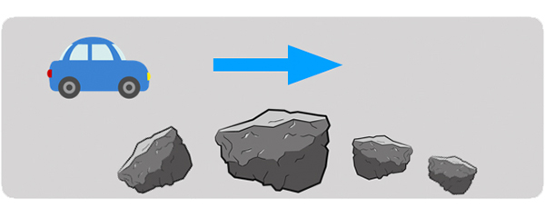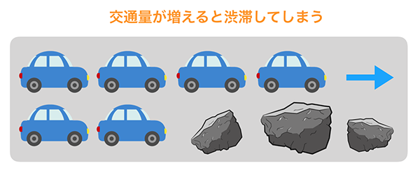 車の流れ=血液の流れ、石のような障害物=プラークとすると、交通量が多くない=体への負荷が小さい状態では渋滞は起きません。