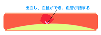 狭心症は血管が細くなる病気でしたが、心筋梗塞は血管が詰まる(=梗塞)病気です。典型的には動脈硬化によって生じたプラークが突然破裂し、そこから出血。血の塊=血栓ができることで、血管を詰まらせます。