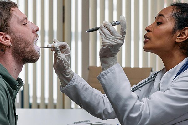 喉に綿棒を入れて検体を採取し、5分程度で結果の出る迅速キットで簡便に検査ができます。