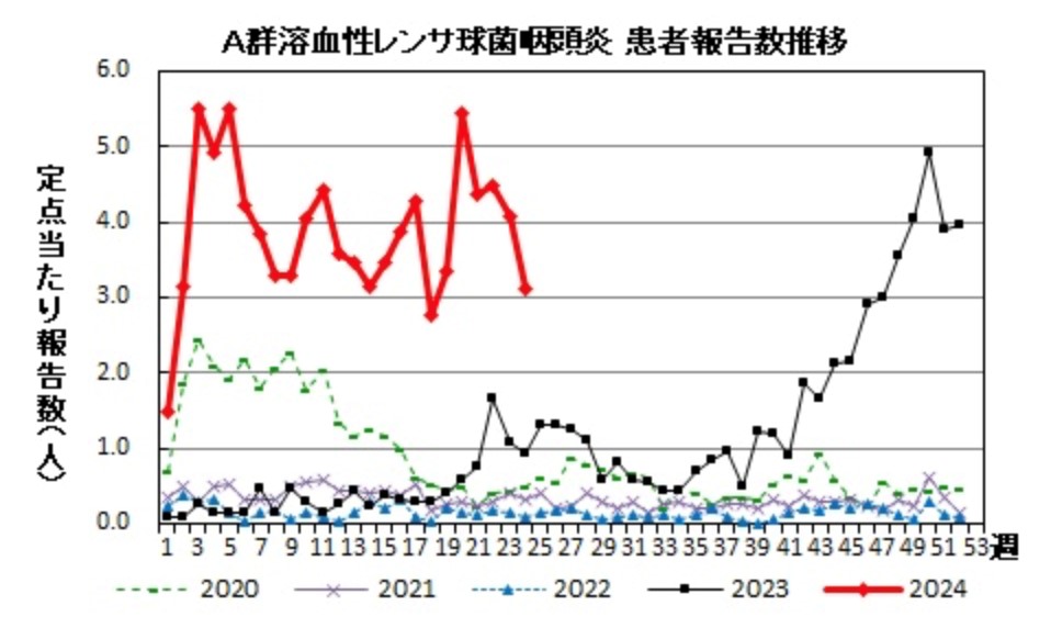 県の発表によれば群馬県での溶連菌感染症の流行状況は6月19日現在、以下のようになっています。