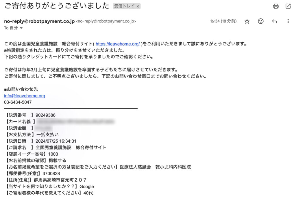 このたび2024年7月25日に全国児童養護施設 総合寄付サイトを通して高崎市内の児童養護施設「希望館八幡の家」様へ寄付をさせていただいたことをご報告させていただきます。