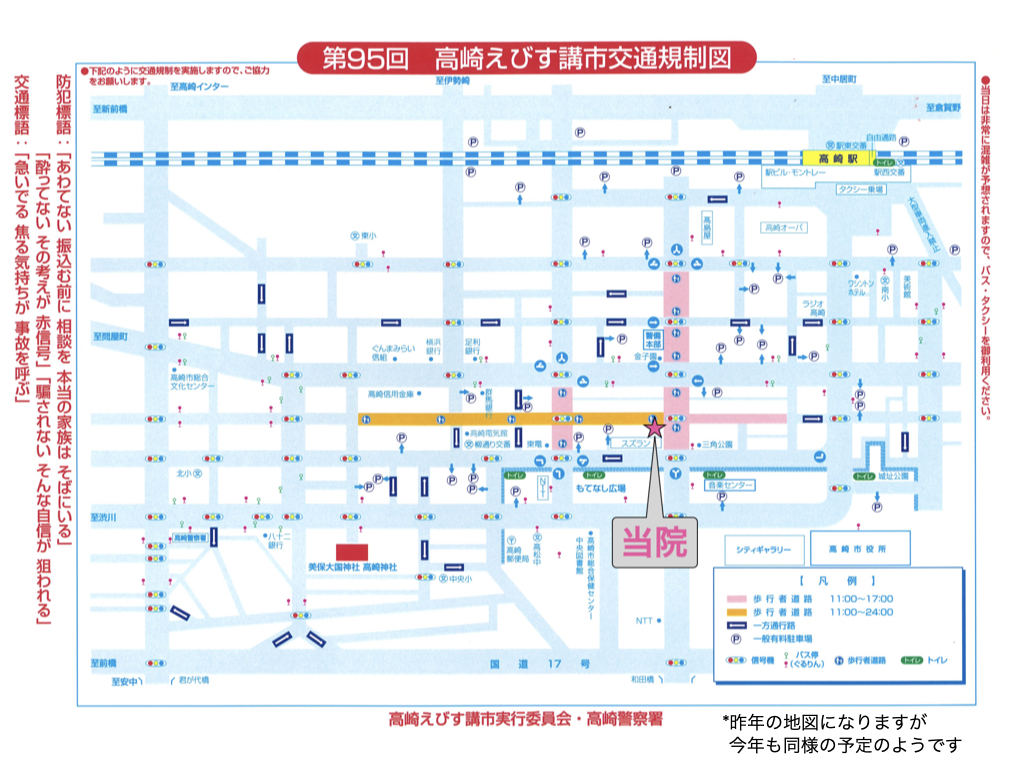 11月16日(土)はえびす講市の開催に伴い、午前11時から医院周辺の交通規制が行われます。
