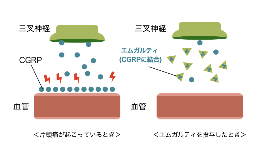 CGRPは、片頭痛を引き起こすとされている物質で、三叉神経という神経からCGRPが過剰に発現することにより血管拡張や神経原性炎症を介して片頭痛発作を引き起こすといわれております。