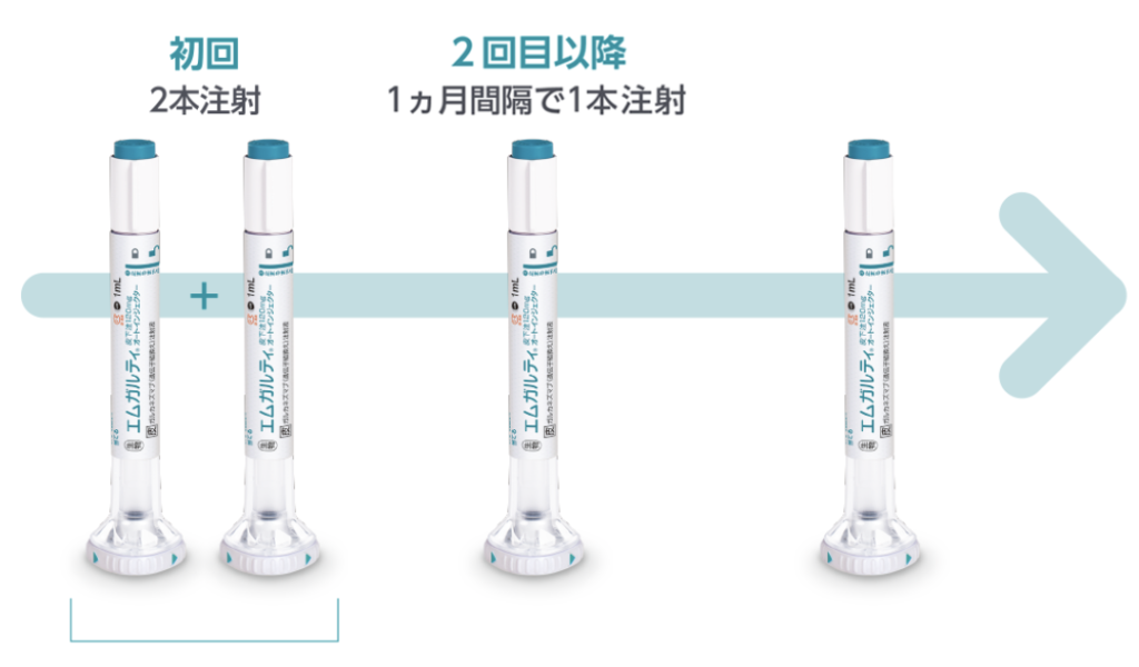 エムガルティは注射するタイプのお薬です。初回は2本、2回目以降は月に1本注射をします。