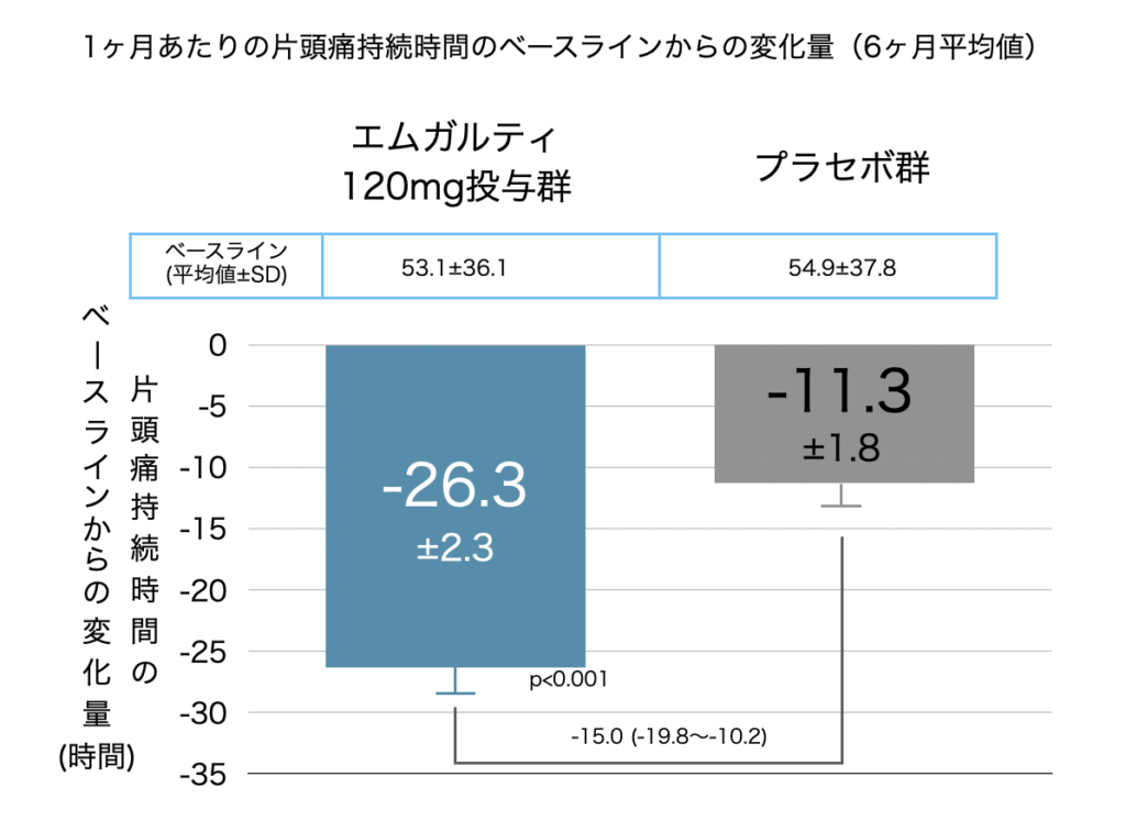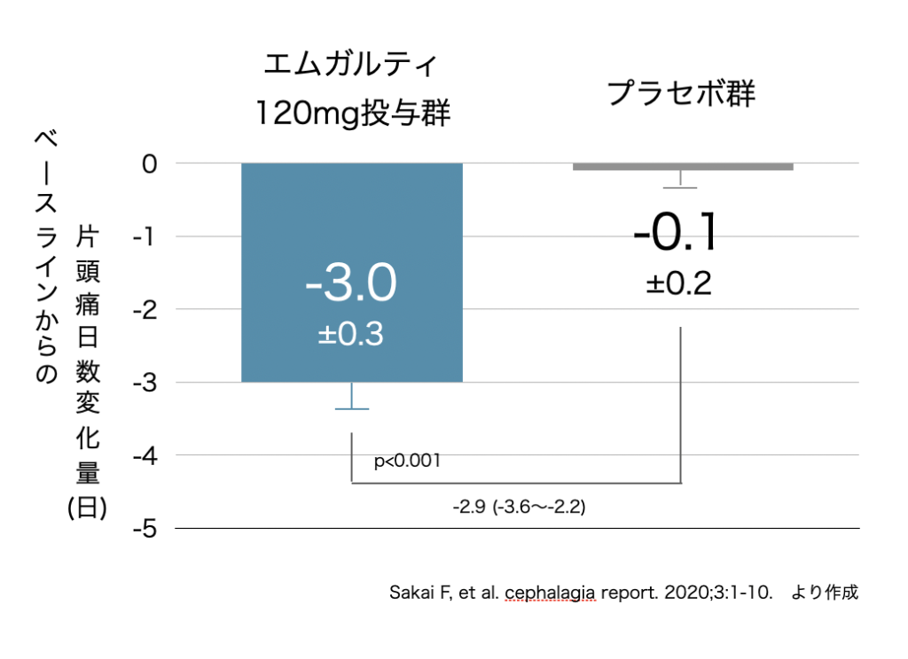 国内第II相試験(CGAN試験(4))では急性期治療薬を必要とした1ヶ月あたりの頭痛回数のベースラインからの変化量(6ヶ月平均)がプラセボ群-0.1日に対してエムガルティ投与群では-3.0日と減少していました。