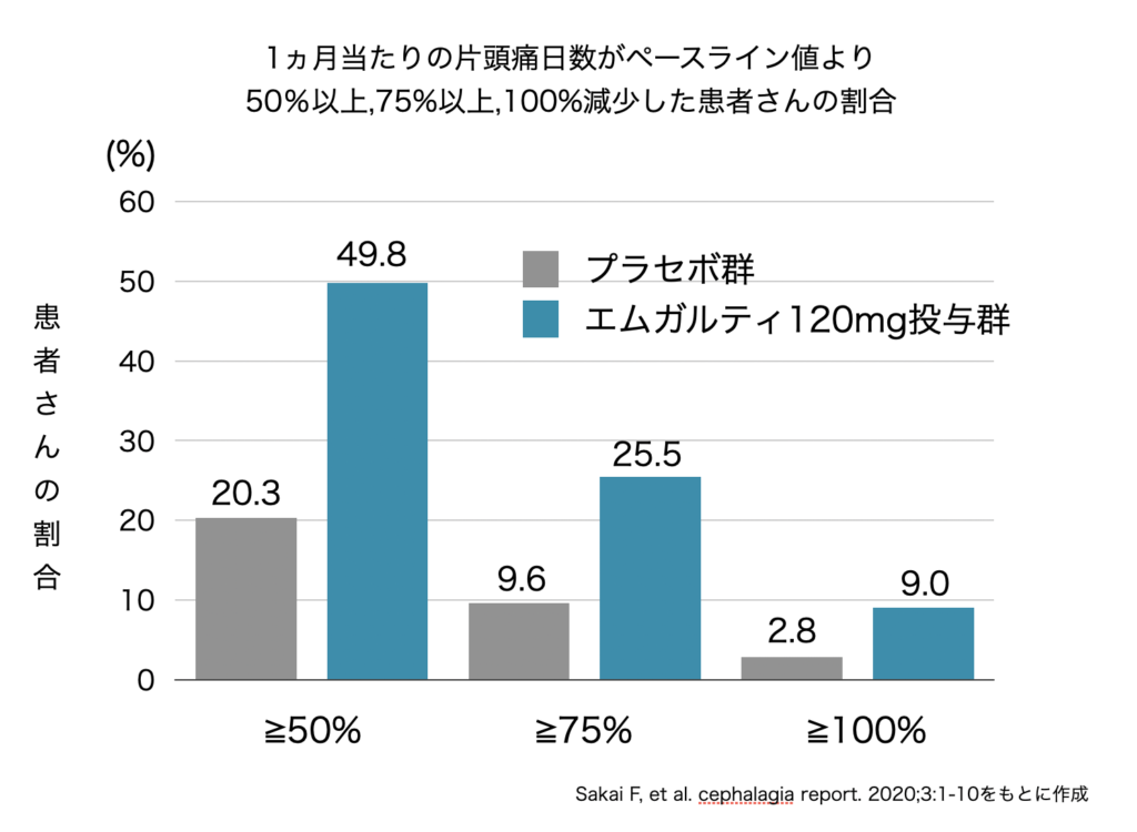 さらに50%反応率(1ヵ月当たりの片頭痛日数がペースライン値より50%以上減少した患者さんの割合)はプラセボ群20.3%に対してエムガルティ投与群で49.8%と大きく低下していました。