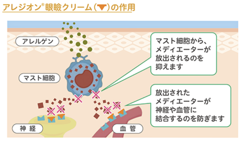 花粉症では花粉が涙に触れると目の中にアレルギー症状を引き起こすヒスタミンなどの物質が放出され、目のかゆみや充血などの症状が現れます。アレジオン眼瞼クリームは目の中(結膜)まで浸透したお薬が、ヒスタミンなどの物質が放出されるのを抑えたり、ヒスタミンが働くのを防いだりすることで、目のかゆみや充血などの症状を抑えます。