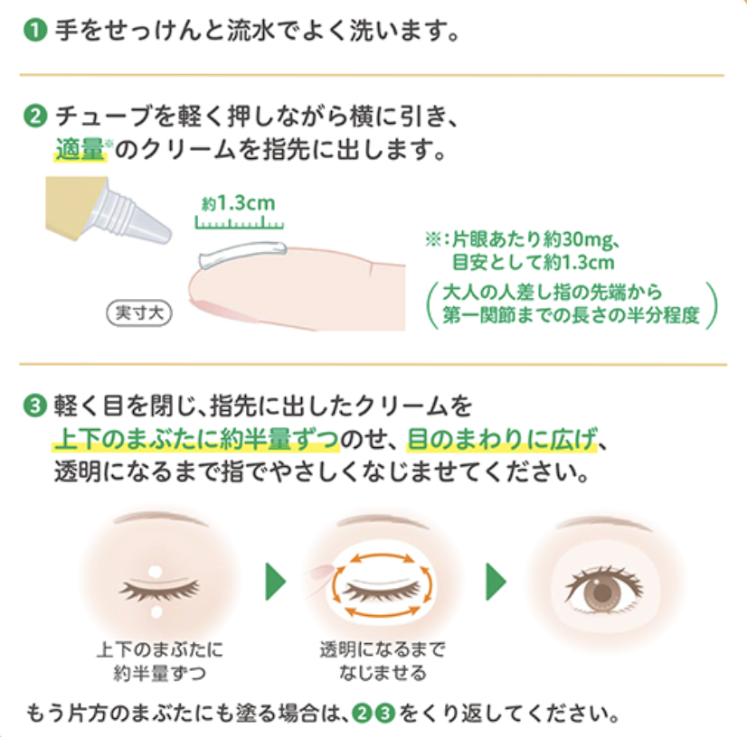 ・手を石けんと流水でよく洗った後、チューブを軽く押しながら横に引き、適量のクリームを指先に出します。1回の使用量は、片目あたり約30mg(絞り出したクリームの長さとして約1.3cm)、大人の人差し指の先端から第一関節までの長さの半分程度が目安です。