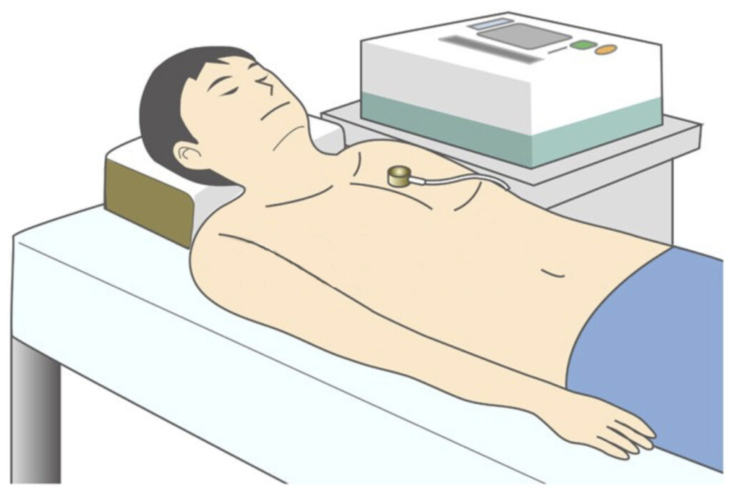 お胸の上にパソコンのマウス程度の大きさのデバイスをおいて8秒間測定することで心音図と心電図のデータがデジタルに記録できます。