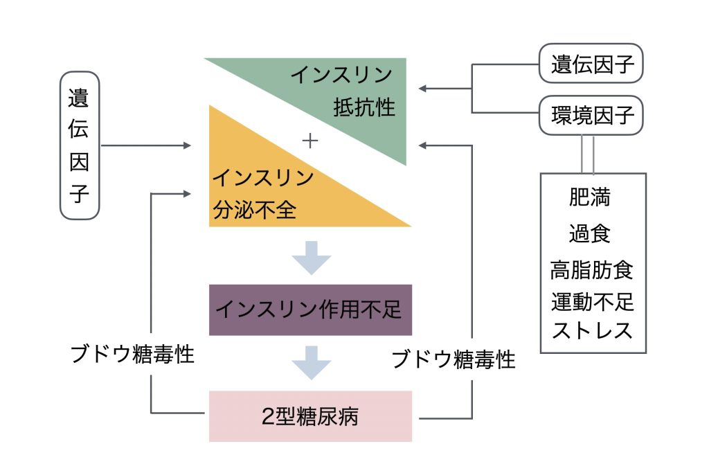 遺伝的素因によるインスリン分泌能の低下に、環境的素因としての生活習慣の悪化に伴うインスリン抵抗性が加わり、インスリンの相対的不足に陥った場合に糖尿病を発症します。