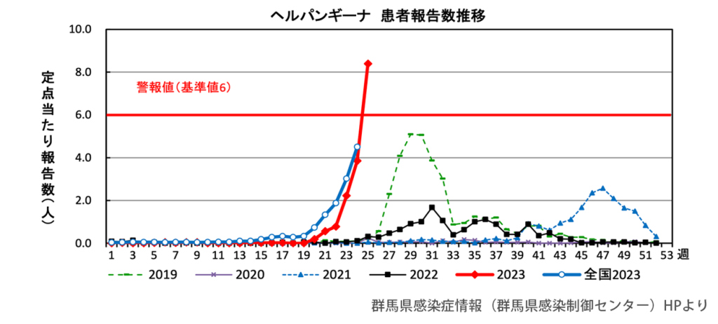 主に子どもに感染する夏かぜである「ヘルパンギーナ」が急増し、群馬県では7年ぶりに流行警報が発令されています。