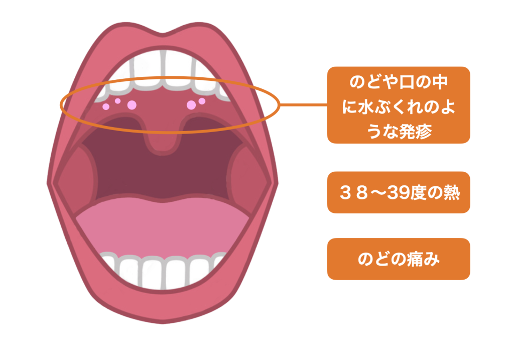 高熱に加え、のどの痛みから食べものを食べられない、水分が飲めない、不機嫌になるといったことで発症に気づくことがしばしばあります。