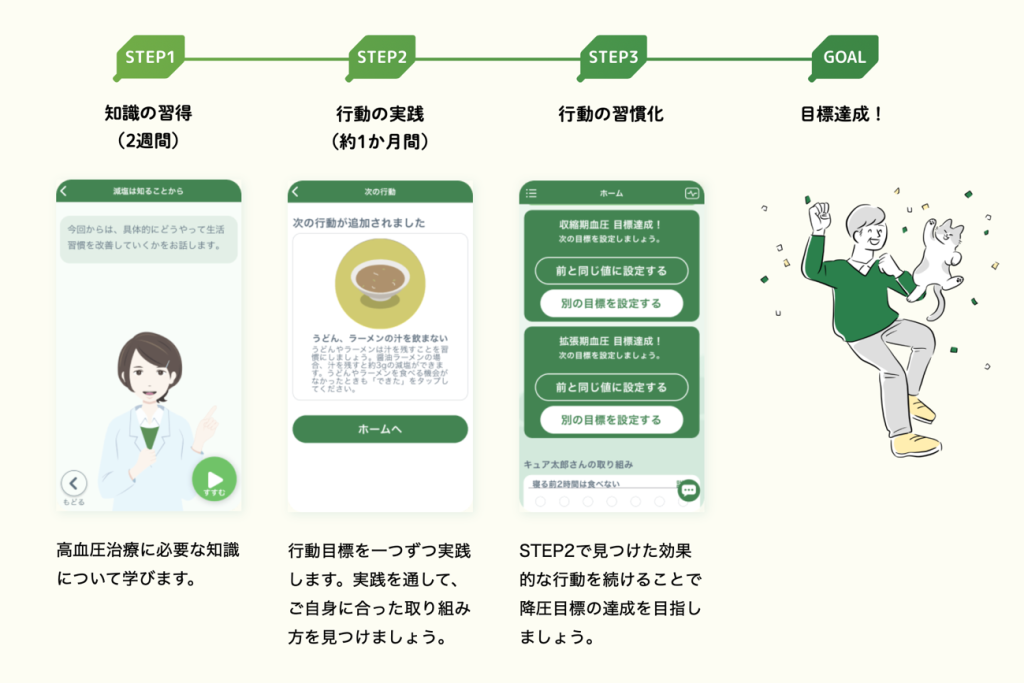 具体的には、CureApp HTというアプリを用いての生活習慣の修正、患者による血圧測定、医師の指導を組み合わせた6カ月間の短期集中プログラムになります。