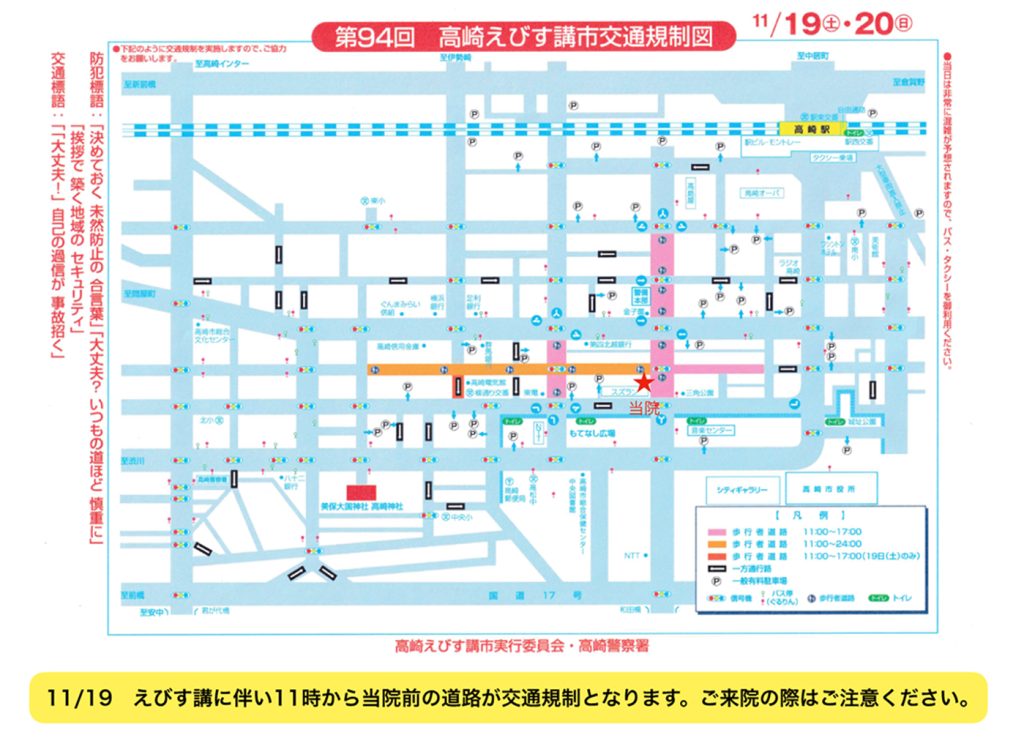 えびす講の開催に伴い、当院前の道路が午前11時より交通規制となり、車での出入りが不可能となります。