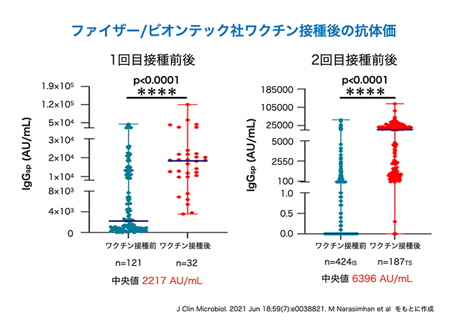 最近の欧米の研究では、ファイザー社/ビオンテック社製のワクチン接種後の抗体価について、1回目の接種後の中央値 2,217 AU/mL, 2回目の接種後の中央値 6,396 AU/mL と報告されています。