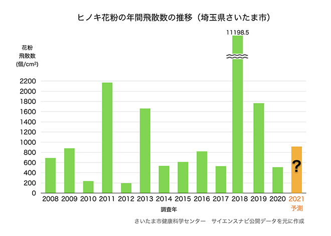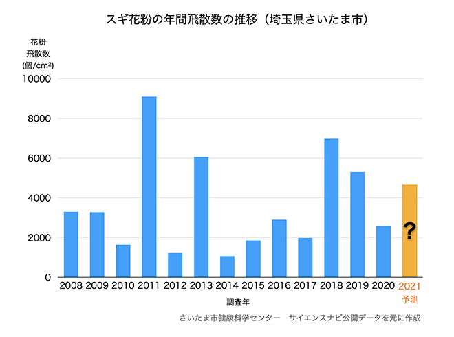 過去10年の花粉飛散量推移と今年の予測を並べてみると