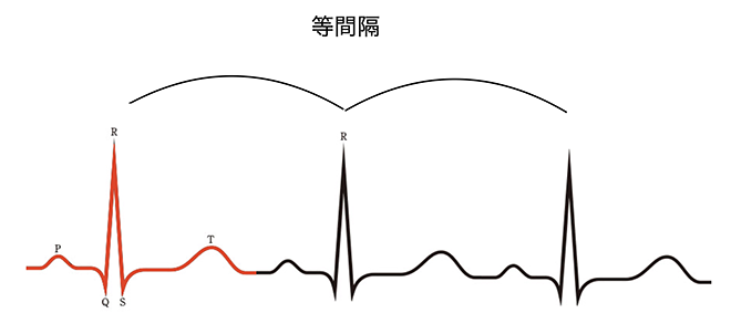 通常心臓は一定のリズムで動いており、心電図ではこれを大きい波(Rと書いてある波)から次の大きい波までの間隔が一定かどうか、で判断します(専門的にはRR間隔が整か不整かと表現します)。
