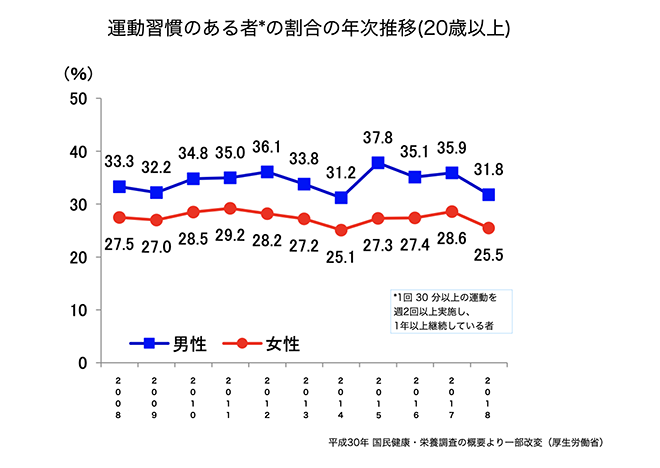 さらに、同調査によれば、成人で運動習慣がある人の割合は、男性で31.8%、女性で25.5% と決して高い数字ではありません。