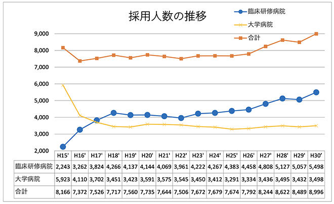 また待遇面も民間病院の方が手厚い場合も多く、厚生労働省の公開しているデータ(上図)によれば、2018年では大学病院3500人に対し民間病院5500人と、近年は民間病院を選択するケースが1.5倍以上となっています。