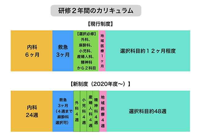 図にお示しした通り、2020年4月から一部制度が変更になるものの、2年間の中で内科に6ヶ月、救急3ヶ月、地域医療1ヶ月配属となるのは基本的には変わりません。