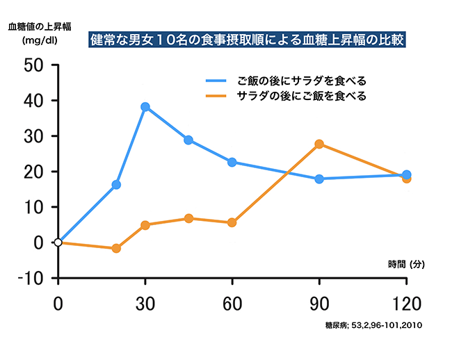食物繊維やビタミンが豊富に含まれる野菜はからだによいだけでなく、後から食べる主食の糖質がゆっくりと吸収され、食後の急激な血糖値の上昇を抑えてくれます。血糖値は高いことも問題ですが急激な上がり下がりもよくないことがわかっており、食後の血糖上昇を抑えることはとても重要です。