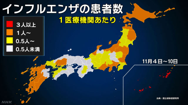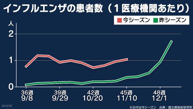 国立感染症研究所によると、今月10日までの1週間に全国およそ5000の医療機関(小児科約3000、内科約2000)から報告されたインフルエンザの患者数は、5084人で、1医療機関当たりの患者数は1.03で、流行開始の目安とされる「1」を超え、国立感染症研究所は15日、全国的な流行期に入ったと発表しました。たしかに例年と比較し早いことがわかります。
