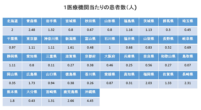 実際の都道府県ごとの患者数を並べてみると、関東地方では東京都、神奈川県、茨城県で1.1とわずかに1を超え、「流行」の基準はみましているものの、爆発的な流行に至っているわけではなく、九州地方、特に沖縄県での患者数が多いことがわかります。